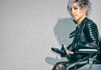 The clothing that Nordstrom models wear is not adapted in any way. The model wearing Nikes has one on his foot and the other on his prosthetic device. The model in the wheelchair has short spiky hair as part of the punk look of her outfit, which includes a dark leather jacket along with the featured sale item, short boots with a buckled strap.